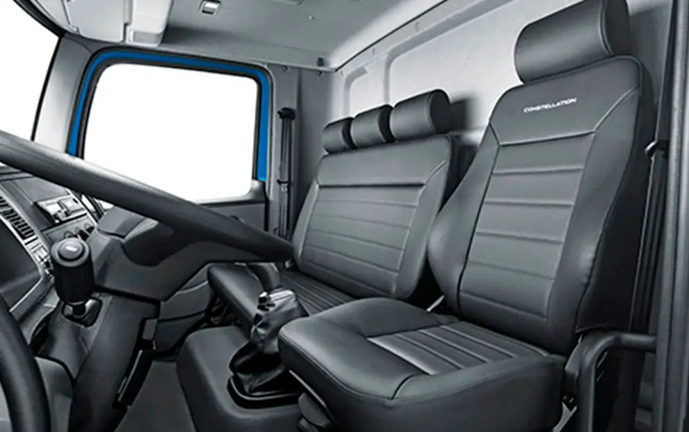 A cabine Constellation é ideal para o segmento com banco para 3 passageiros com encosto de cabeça de série, que traz todo o conforto e segurança necessários para os ocupantes, e com revestimentos lavaveis que garante maior facilidade no dia a dia da operação Conta com o para-choque curto e metálico pronto para encarar qualquer situação! E mais, agora com DRL integrado aos faróis, luzes de posição e lanternas traseiras em LED: mais visibilidade e segurança! São diversas facilidades que irão lhe surpreender!