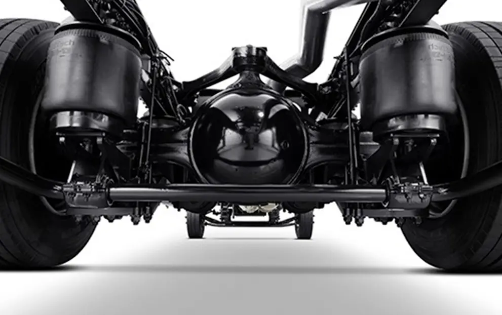 Molas Semi-elípticas, amortecedores hidráulicos de dupla ação, com barra estabilizadora / Pneumática com 4 bolsões de ar, amortecedores hidráulicos de dupla ação e barra estabilizadora