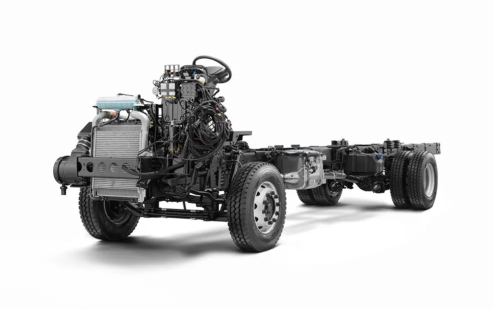 Duplo, independente, freio de serviço com ABS, 4S e 4M, EBD, ATC, HSA e ESC. Reservatório de ar e unidade processadora de ar com filtro coalescente.
