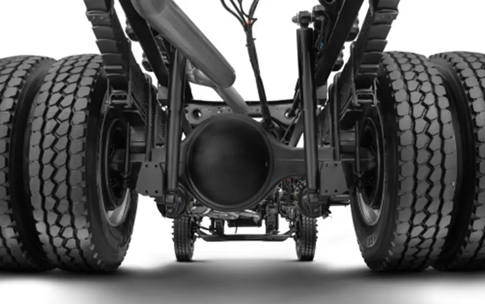 Molas semi-elípticas, com auxiliares parabólicas e de borracha (3° estágio), amortecedores hidráulicos de dupla ação, com barra estabilizadora - Suspensão elevada