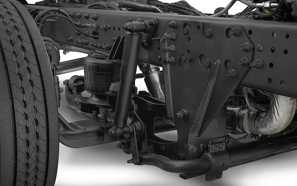 Molas Semi-elípticas com auxiliares parabólicas e de borracha (3° estágio), amortecedores hidráulicos de dupla ação, com barra estabilizadora / Pneumática com 4 bolsões de ar, amortecedores hidráulicos de dupla ação e barra estabilizadora